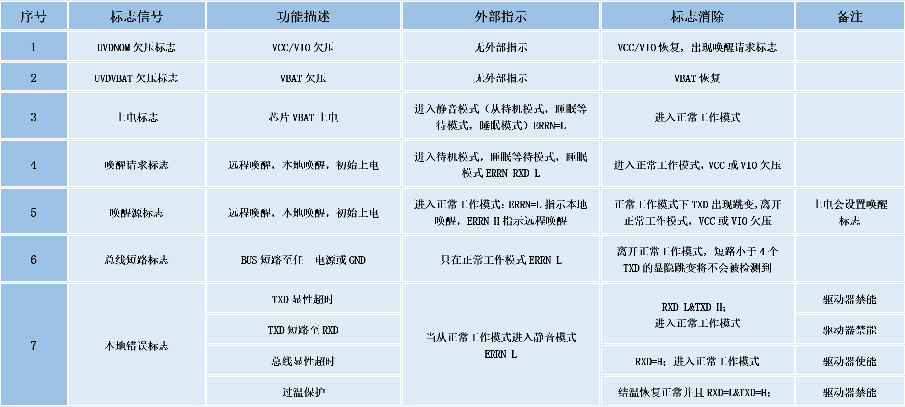SIT1043Q使用7個內部標志來實現故障安全的回退模式控制和系統診斷。主控制器可以通過引腳ERR_N輪詢其中的五個標志,功能標志執行操作如下表1所示。