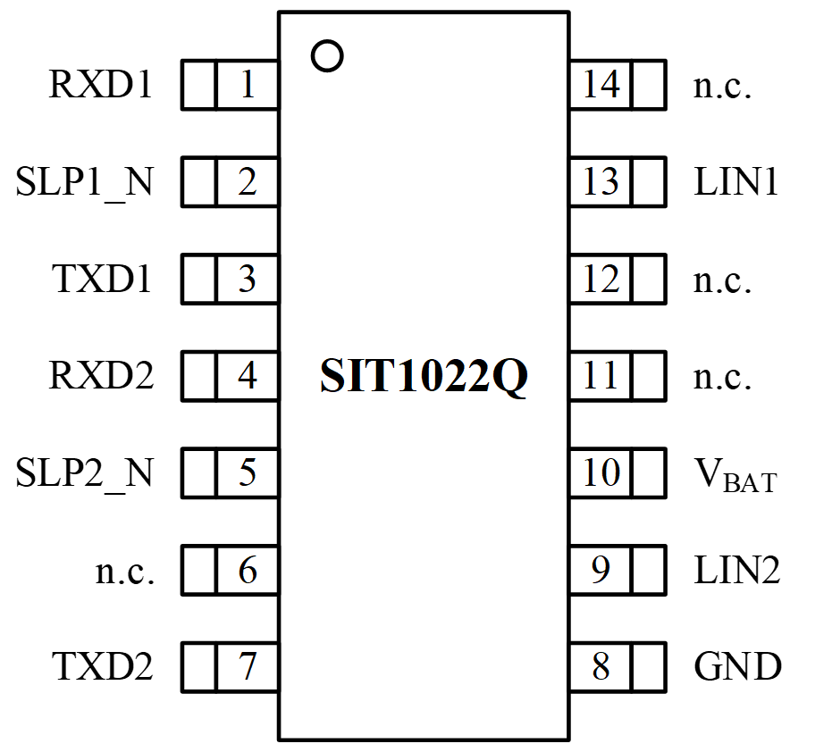 SIT1022Q是一款雙通道本地互聯(lián)網(wǎng)絡(luò)(LIN)物理層收發(fā)器,符合LIN 2.0、LIN 2.1、LIN 2.2、LIN 2.2A、ISO 17987-4:2016 (12V) 和SAE J2602標(biāo)準(zhǔn)。主要適用于使用1kbps至20kbps傳輸速率的車載網(wǎng)絡(luò)。SIT1022Q通過TXDx引腳控制 LINx總線的狀態(tài),可將協(xié)議控制器的發(fā)送數(shù)據(jù)流轉(zhuǎn)換為具有最佳壓擺率和波形整形的總線信號,以最大程度地減少電磁輻射發(fā)射(EME)。LIN總線輸出引腳具有內(nèi)部上拉電阻,僅當(dāng)用作主機(jī)節(jié)點(diǎn)時(shí),才需將LIN總線端口通過一個(gè)與二極管串聯(lián)的外部電阻上拉至VBAT。SIT1022Q通過LINx引腳接收總線上的數(shù)據(jù)流,并由接收器的輸出引腳RXDx將數(shù)據(jù)傳送到外部的微控制器。