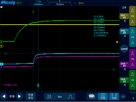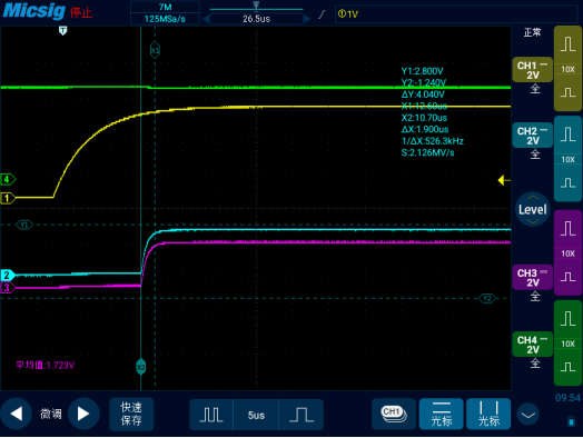 其中部分測(cè)試波形如下:(示波器通道1(黃色)接VIO,通道4(綠色)接VCC,通道2(藍(lán)色)CANH,通道3(紫色)接CANL)