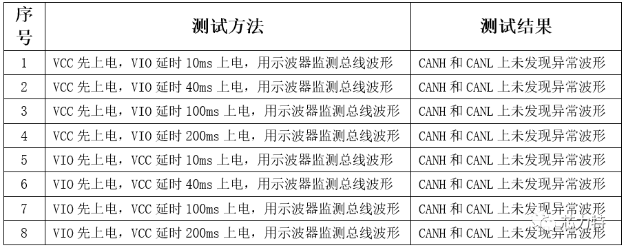 另外,當(dāng)VCC與VIO不同時(shí)上電,在芯片開(kāi)始工作的瞬間,SIT1051T/3也不會(huì)對(duì)總線造成干擾,具體測(cè)試如下: