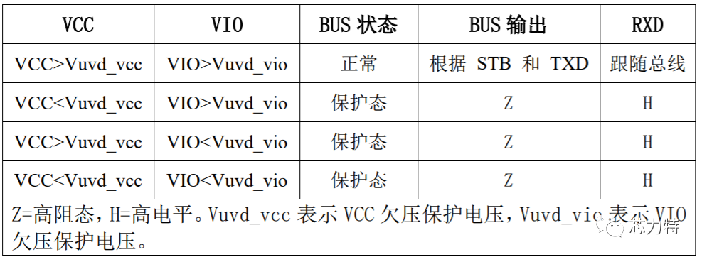 VCC與VIO必須都供電,芯片才能正常工作,當(dāng)SIT1051T/3所在的系統(tǒng)MCU是3.3V供電時(shí),VIO接3.3V;當(dāng)其所在的系統(tǒng)MCU是5V供電時(shí),VIO接5V;兩個(gè)引腳都具有欠壓保護(hù)功能,如下圖當(dāng)VCC與VIO引腳電壓小于欠壓保護(hù)電壓時(shí)總線CANH、CANL及RXD的狀態(tài):